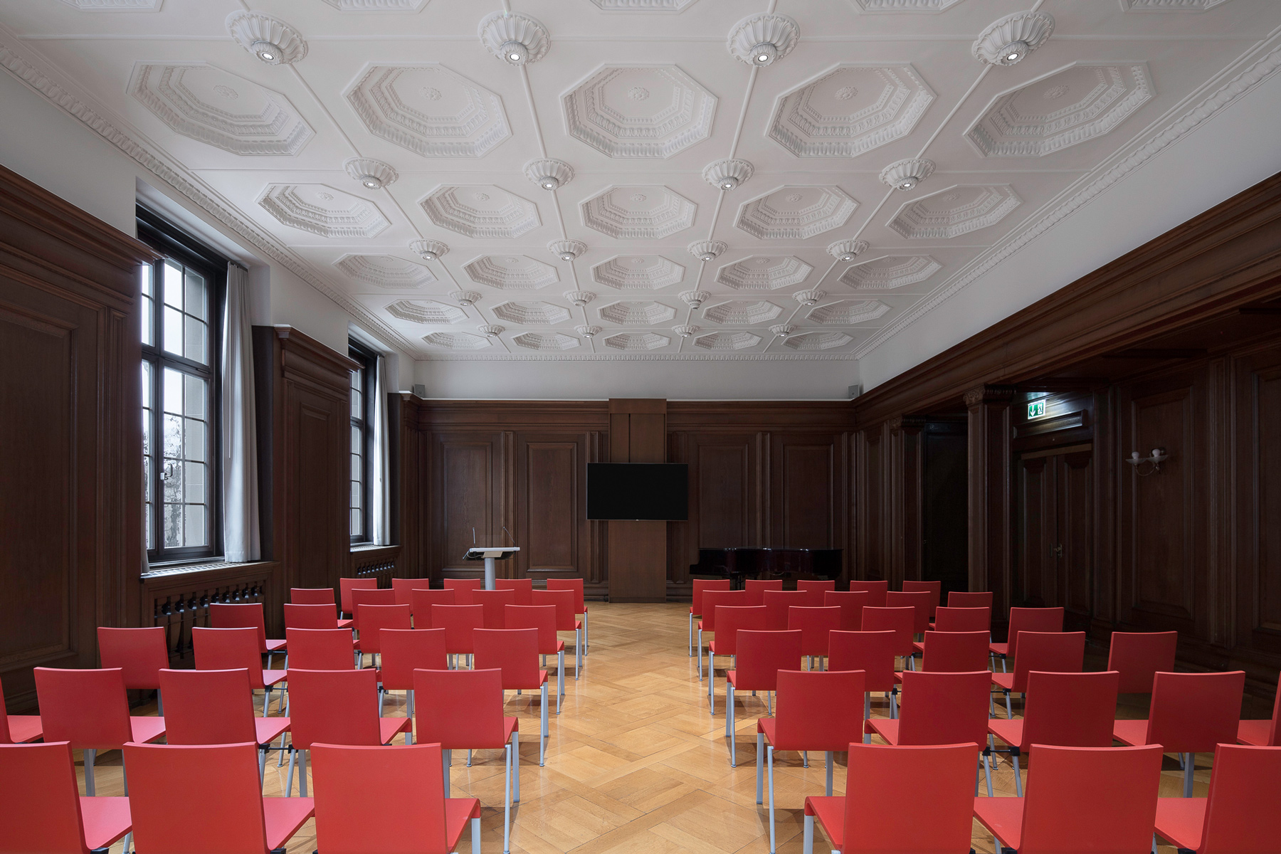 Das Beleuchtungskonzept für den Vortragssaal sollte auch die Flexibilität verbessern, da der Raum für eine Vielzahl von Veranstaltungen genutzt wird.  Aus diesem Grund wurden zwei Beleuchtungsebenen vorgesehen: Die vorhandenen Leuchtenpositionen der ehemaligen Stabpendelleuchten wurden durch, in die Deckenrosette integrierte tunable-white Downlights zur Ausleuchtung des Raumes ersetzt. Zusätzlich wurde eine umlaufende, in die Holzvertäfelung integrierte Indirektlichtebene zur Deckenaufhellung hinzugefügt, um die prächtigen Stuckarbeiten zu betonen. Dank vordefinierter Lichtszenen kann die Beleuchtung nun entsprechend der unterschiedlichen Nutzung des Raumes ausgewählt werden.
