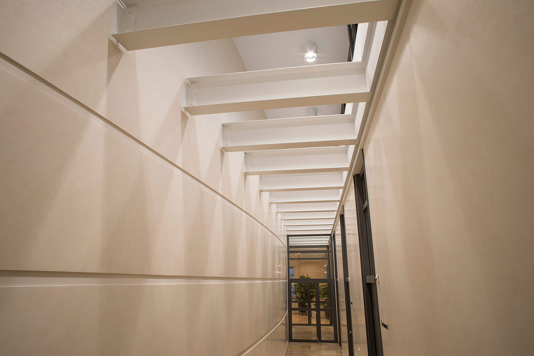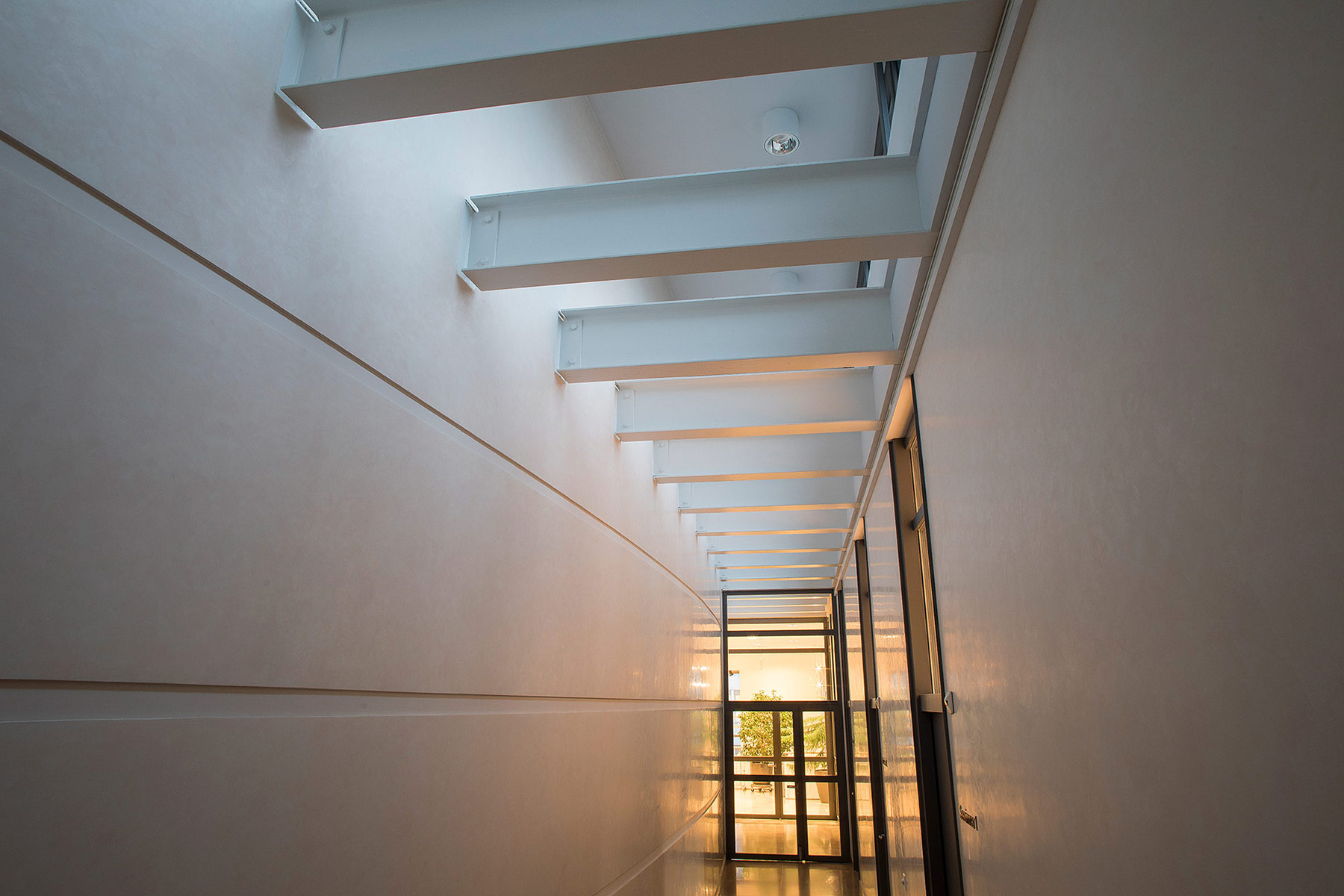 Die Lichtplanung strukturiert die Raumabfolge, die Formen- und Materialsprache der Beleuchtung unterstützt die Hierarchiestufen innerhalb der Treppenkerne.