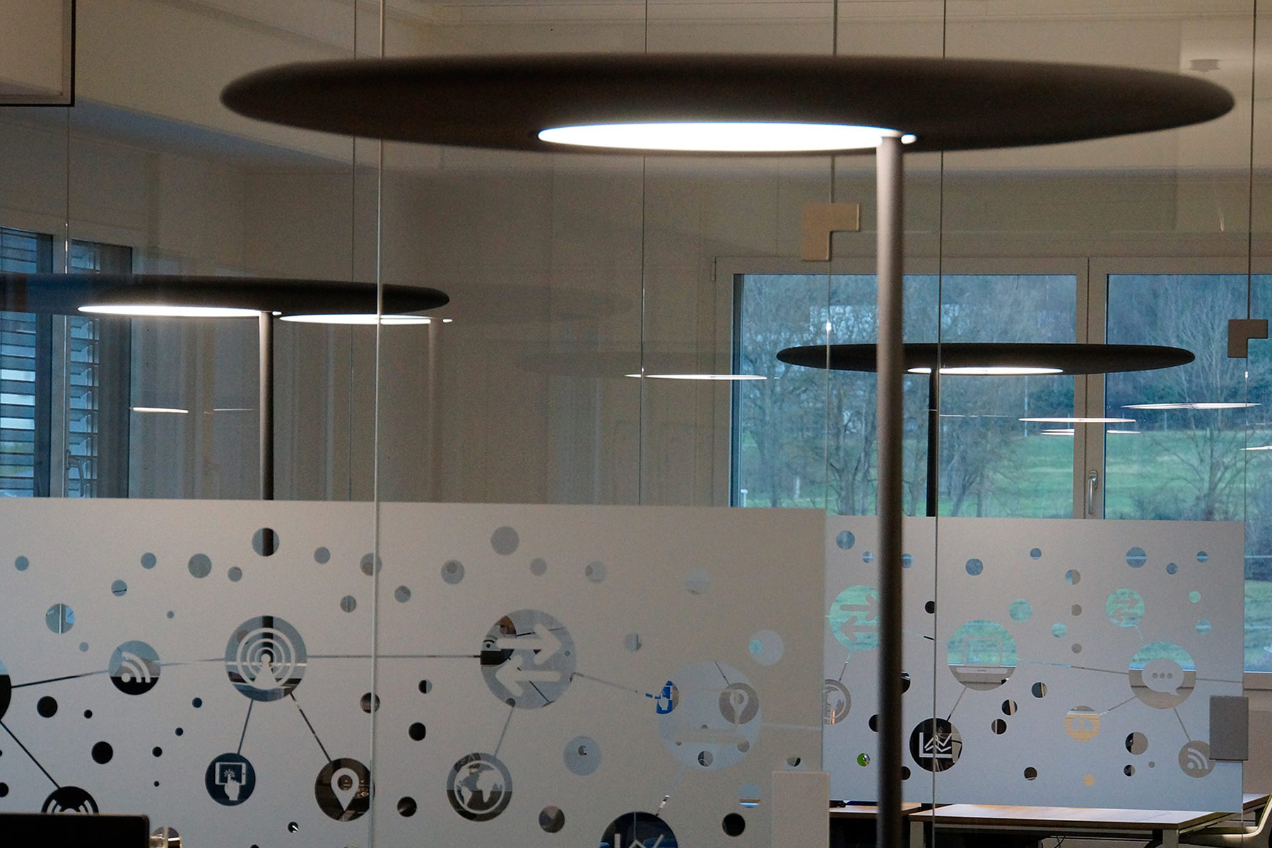 Das Zusammenspiel aus Licht und Akustik zeichnet die neuen Büroräumlichkeiten der mediasens AG in Schaan aus. Effiziente, Tageslicht und Präsenz gesteuerte Stehleuchten fügen sich ideal in die Bürostruktur ein. Die akustischen Absorber, die als Teil der Stehleuchten ausgebildet wurden sind abgestimmt auf das applizierte Grafikdesign der Trennwände. Durch die Kombination von Stehleuchten und akustischen Absorbern konnte auf eine zusätzliche deckenbezogene Akustikinstallation verzichtet werden.