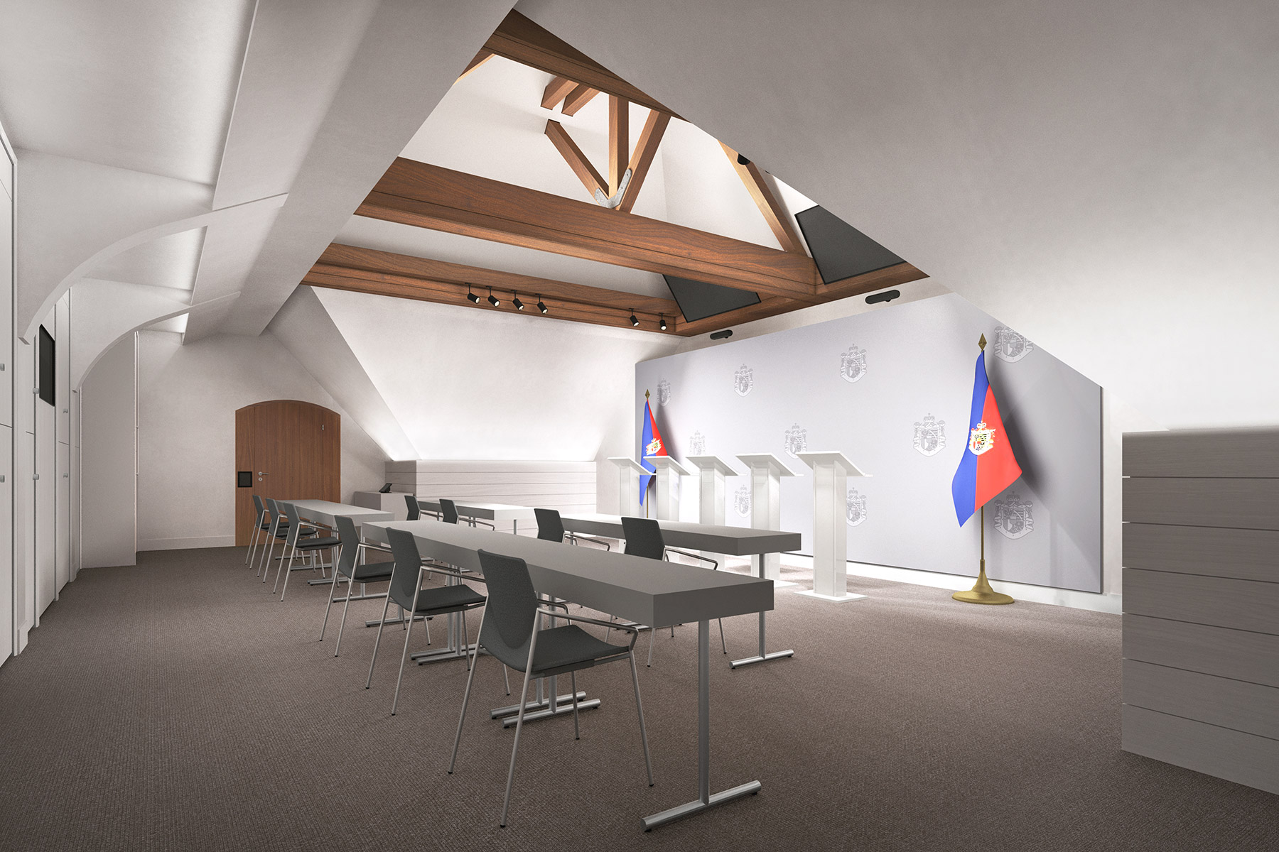 Die Lichtplanung des Kommissionszimmers im Regierungsgebäude wurde konsequent sachlich und schlicht gehalten.