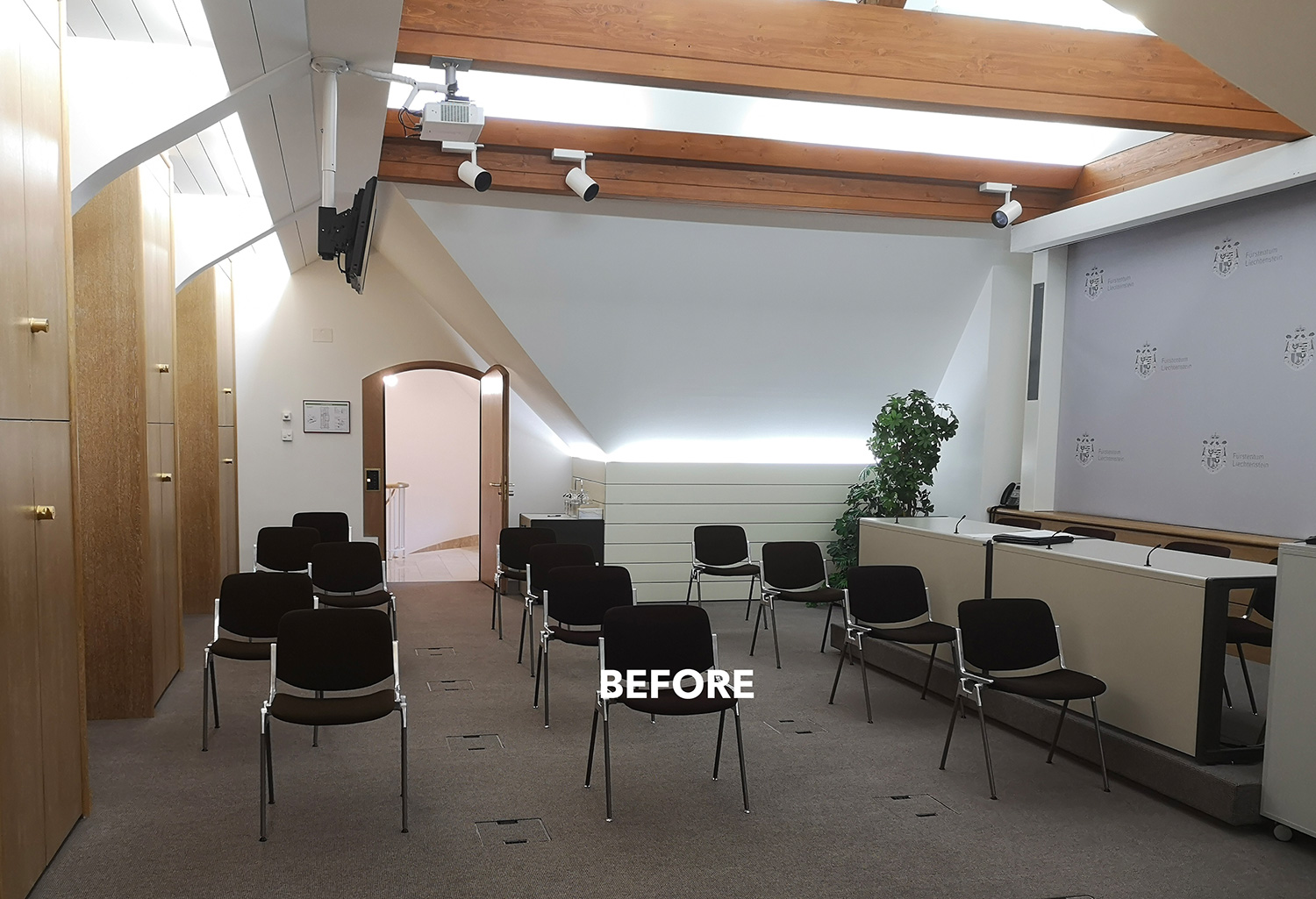 Mit der Modernisierung der Medientechnik im Medienraum der Regierung des Fürstentum Liechtensteins wurde bei diesem Umbauprojekt auch die Beleuchtung für die Ansprüche der TV- und Bildschirmübertragung angepasst und optimiert.