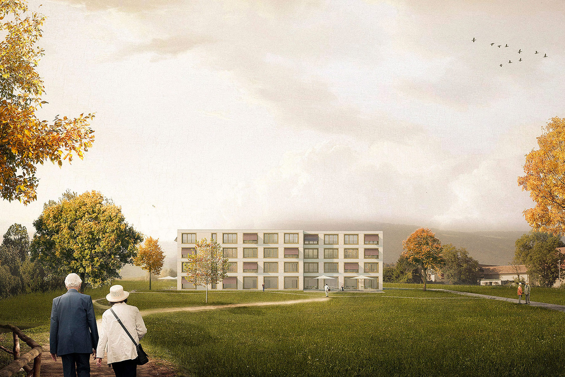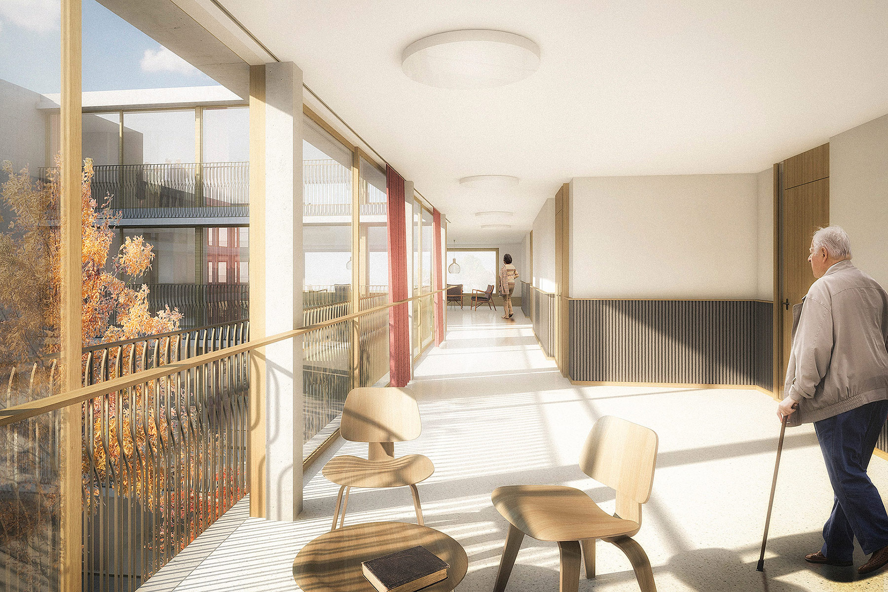 Der Ausblick und  Rundgang um den “Garten des Lebens” im Herzen der Anlage bilden die zentralen Schwerpunkte des Projektes. Die Struktur der drei Etagen bietet in den sich ausweitenden Korridoren ideale Nischen für Aufenthalts- und Essräume auf den verschiedenen Abteilungen und laden dank des weiträumigen Konzepts zum Flanieren ein. Damit werden die Korridore zum Ort der Begegnung und der Kommunikation und animieren den Blick auf den Innenhof.