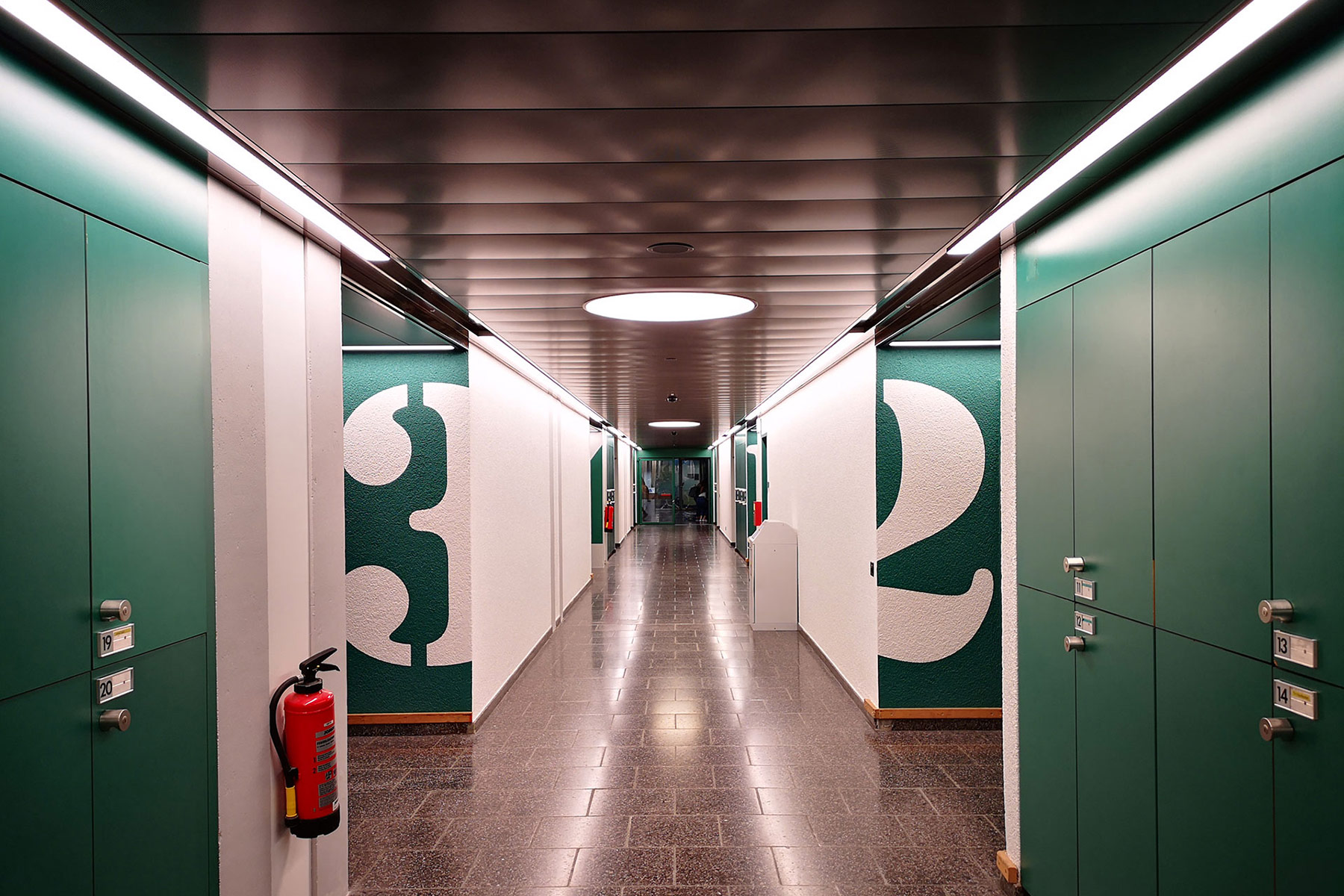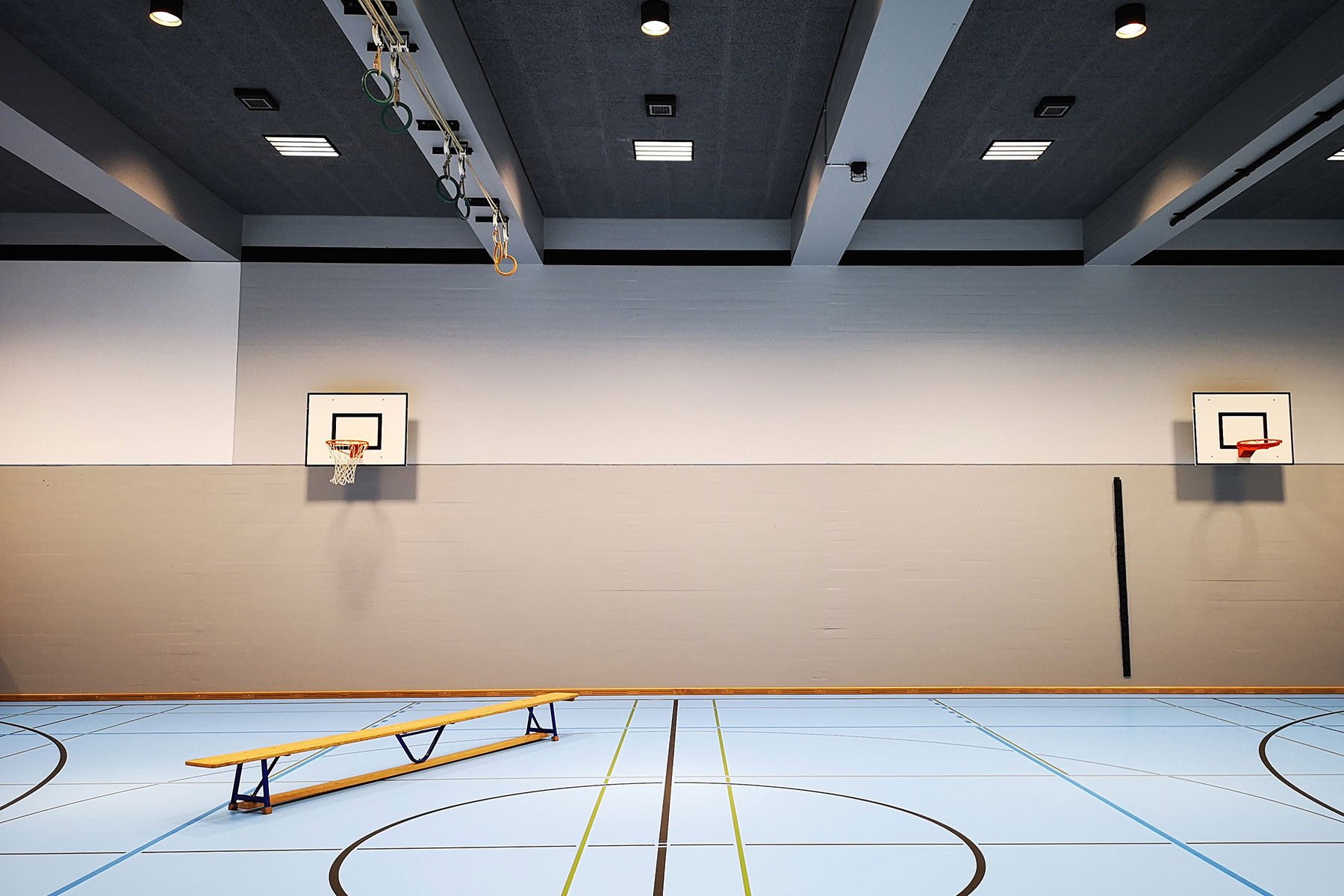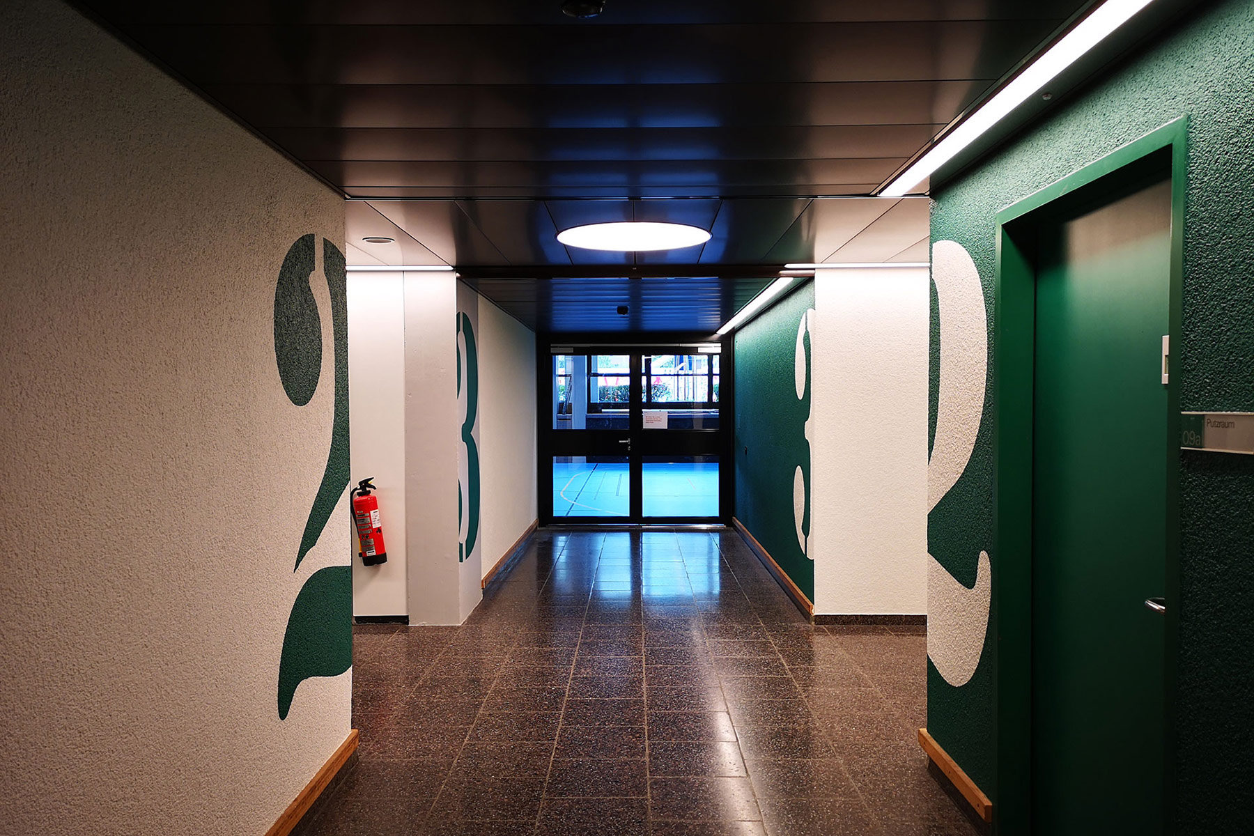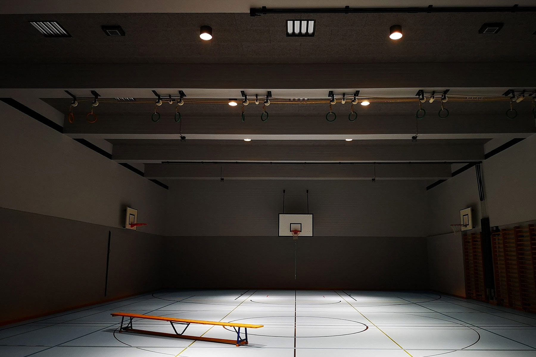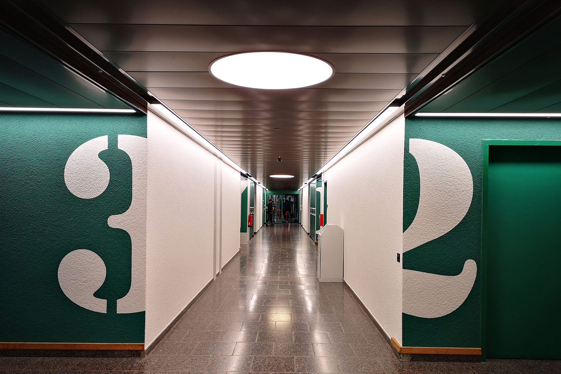 Die KV-Business School am Escher-Wyss-Platz ist die grösste kaufmännische Berufsschule der Schweiz und zählt zu den grössten Unterneh­men des Bildungswesens im deutschsprachigen Raum. Die Schule wird von über 4000 Lernen­den besucht. 1974 zog die Handelsschule in ein neues Schulhaus an der Limmatstrasse beim Escher-Wyss-Platz. Das in die Jahre gekommene Schulhaus ent­sprach nicht mehr den aktuellen Bedürfnissen und der Stand der Technik war ebenso veraltet. In einer ersten Etappe wurden daher die 4 Turn­hallen sowie der zentrale Erschliessungskorridor einschliesslich des Fitnessraumes saniert. Bei der Sanierung ging es den Architekten vor allem darum, das ursprüngliche Gestaltungs- und Materialkonzept soweit möglich beizube­halten. Bei der Beleuchtung im Erschliessungskorridor wurde Wert auf eine vertikale Wandaufhellung gelegt, die den Korridor in der Raumwirkung aufwertet und die Erschliessungsfläche besser strukturiert. Für die Optimierung der Wegefüh­rung dienen runde deckenintegrierte Flächen­leuchten, die die Kreuzungsachsen der Turnhal­lenzugänge markieren. Für die Turnhallenbeleuchtung galt es die Ausleuchtung sowie die Blendungsbegrenzung zu verbessern. Neben der üblichen Grundbe­leuchtung wurde zusätzlich eine dimmbare Akzentbeleuchtung realisiert, die die Nutzung in den Abendstunden für Vereinsanlässe besser abdeckt.